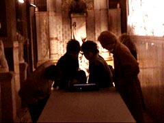 The concept of the piece is to have people virtually experience whether one’s natural voice can be transmitted under bombing in the street. Though it has a deep meaning, visitors were simply crazy over ringing the sound by touching panels. Entering the lecture hall with the roaring sound on my back, numbers of works, most of them were video pieces, were exhibited. The hall itself had a solemn atmosphere surrounded by old wall paintings and sculptures. Inside the hall, those works exhibited within monitors and computers were merged well with the solemn atmosphere and I got a feeling that electronic devices were becoming usual in our minds.