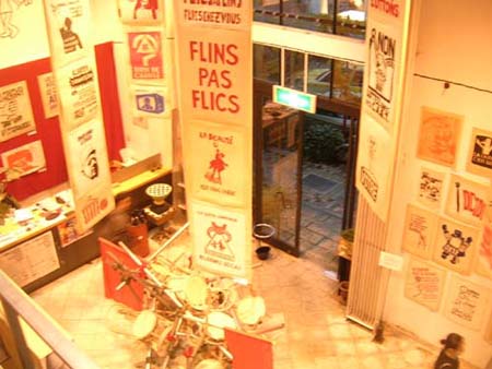 Around the entrance, pictures of the collision between demonstrators and the riot police are printed on the wall and there is an object which combined pipes, chairs and red cloth and it is placed like a barricade. Pictures on the wall are probably from the revolution of May, 1968 in Paris. Around the same time in Japan, there’s also a student movement and the campaign against the Japan-U.S. Security Treaty. The heat of 1968 might have been an universal matter in the world.