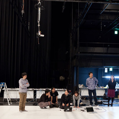 For the planning, I worked with YCAM curator Kazunao Abe, having many discussion about the project. For the actual production work, Robot Search Arms were developed by Ryota Kuwakubo, the programing of Compound Eye film was by Norimichi Hirakawa, and the programing of the wall piece was by Sota Ichikawa. Also, YYCAM InterLab staffs worked on various aspects of all the installations, design of Robot Search Arms, and sound. All of them are more artists than engineers. The fundamental idea of our common recognition “to express” resulted to enhance the quality of the pieces. And, the hardware of the wall piece is designed by Hidehumi Takegahara who also worked on the sensors and devices of “gravicells”. I got a huge support from other YCAM staffs on lighting and mechanisms, as well as documenting the progress, publicity, and documentation.