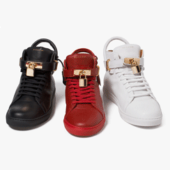 Buscemi brand: a collection of products (cup holders, key chains, skateboards… ) in luxurious leather but also sneakers with 18K gold padlocks that come in two sole heights: 100mm and 125mm. A new color, exclusively for colette: Navy.