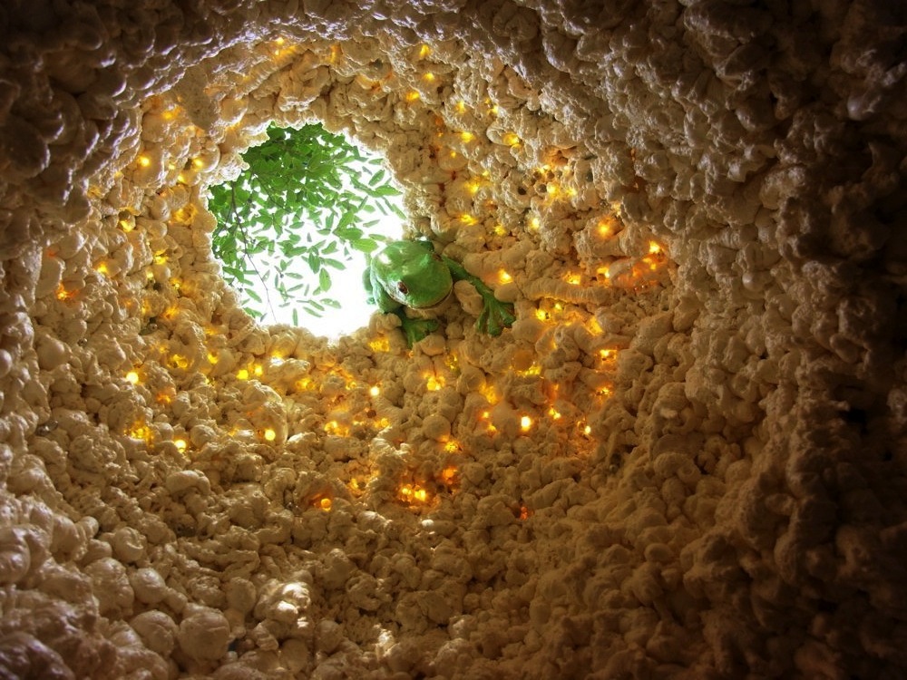 There is a dome in the Rokko Alpine Botanical Garden surrounded by abundant nature. This is “If you were reincarnated as a Forest Green Tree Frog…?” by Hiroshi Niiyama +Kobe Municipal High School of Science and Technology. This work won 2 awards in the festival. You can hear soft, natural sounds like frogs, the movements of the fetus, and rain in the egg shaped dome. The sunshine falls into the dome from the small hole in the top. It is the experience of being reborn from an egg.