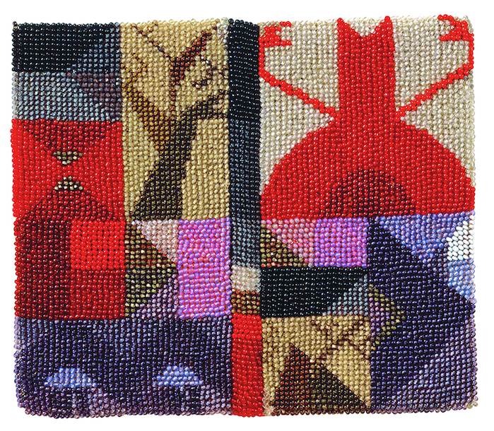 Her early works proved the direction towards abstract and geometric patterns. Composition with Abstract Motifs (Notebook Cover) (c.1917-18), an embroidery work with glass and metal beads, was based on squares, rectangles, triangles, trapezoids, zigzags, semicircles, and asymmetrical forms exuding both warm and cool tones. Vertical- Horizontal Composition with Elements of Objects (c.1919-38), a collage on paper, illustrates varied arrangements of squares and rectangles in a pulsating rhythm, carefully balancing placements of red, blue, green and other colors. The principles of criss-cross stitching contributed greatly to her adoption of vertical-horizontal grids in her compositions.