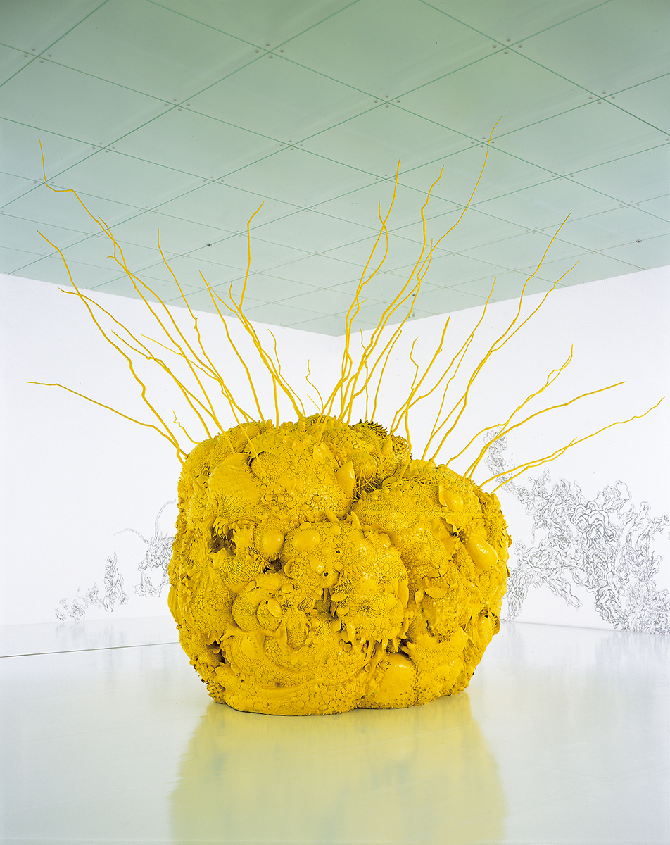 From about 1989, the artistic wave in Japan spun around a bold experimentation with mass-produced items and multimedia. As a metaphor of the outspread spectacle surrounding consumerism and the environment, Noboru Tsubaki has produced “Esthetic Pollution” (1990), a large, amorphous sculpture in yellow-painted polyurethane, clay, and wood resembling a beehive with tree branches jutting out. Tsubaki intended to express human resistance against the natural world and the ecological deterioration that set off the late 1980s economic bubble.