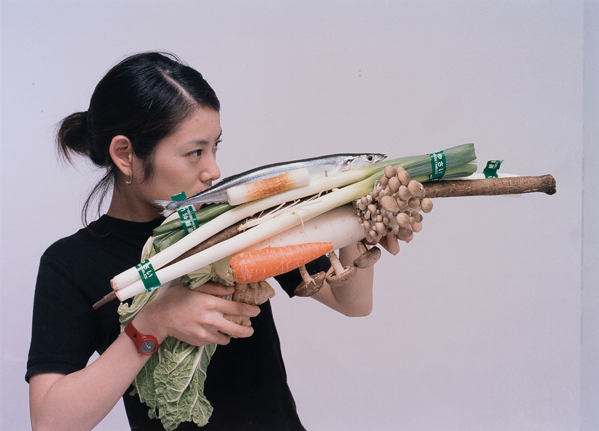In his own piece, “Vegetable Weapon: Saury fish ball hot pot/Tokyo” (2001), photographer Ozawa portrays a local girl holding a makeshift rifle formed by vegetables. The series began in 2001, capturing young women around the world, armed with “vegetable weapons” that are later feasted on in a hot pot meal. The irony feeds on weapons of destruction that transfigure into a source of community sharing. Ozawa, hence, injects ridicule into the idiocy of war and violence.