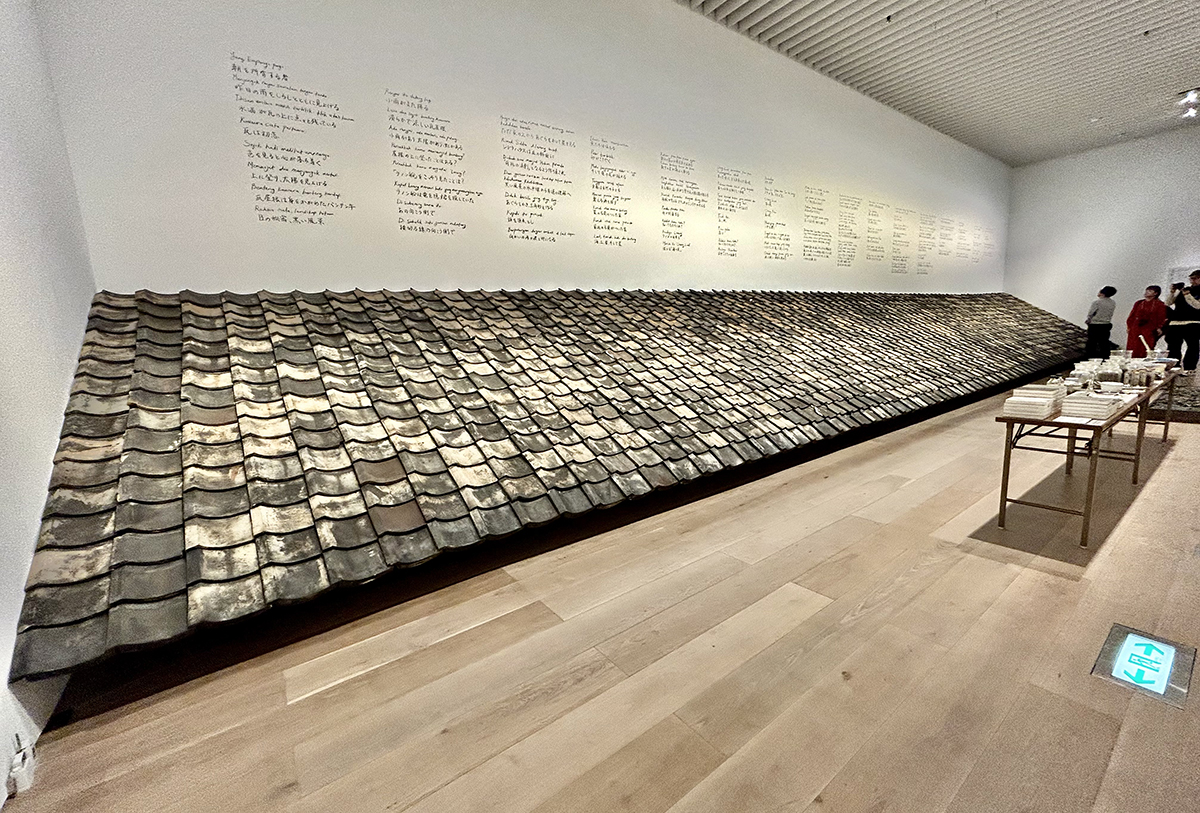 Malaysian artist Shooshie Sulaiman is based both in Muar, Malaysia and Hiroshima. The impressive “Kawara Landskap” (2023) is an enormous wall-to-wall installation of over 1,500 roof tiles taken from abandoned homes in Onomichi, and was shown at the Onomichi City Museum of Art in Hiroshima. Malay poetic texts accompany the artwork, effectively linking art and memoirs with restoration and public empathy.