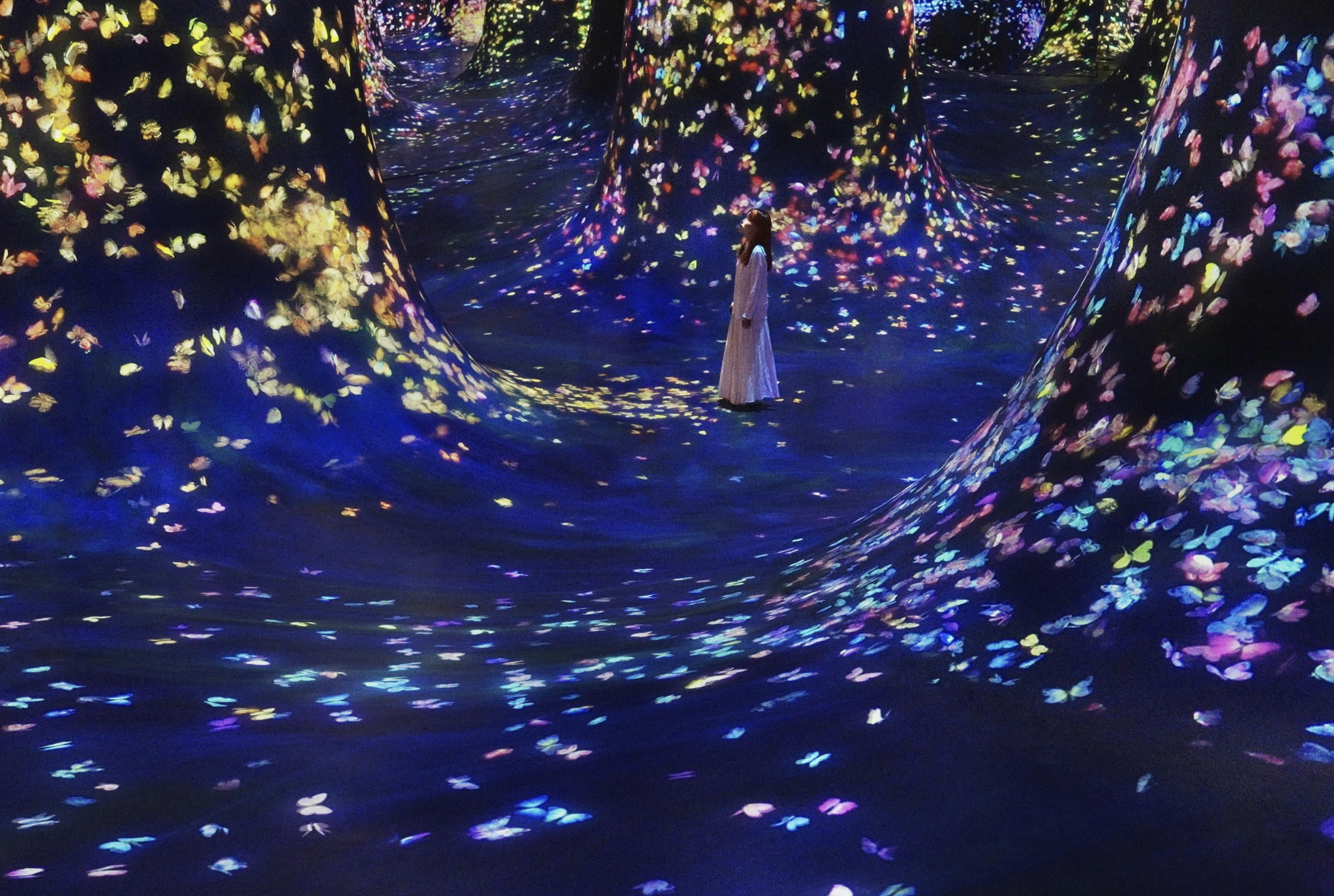 TeamLab’s signature is interactive, sensory art where visitors are not spectators but participants, stepping into a universe where colour, light, sound merge into a single experience. The first major room, Circulating Universe of Water Particles, greets visitors with a wobbly surface and towering columns adorned with mathematically mapped projections, transforming the space into a dynamic forest of motion. Shaped by architecture and the movement of visitors, the countless particles flow and interact, tracing delicate trajectories that envelop the room. Rather than an illusion of depth, the work exists physically alongside the viewer — walls and floors dissolve as boundaries, and the space becomes a shared continuum where motion, presence, and environment merge seamlessly.