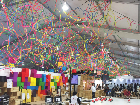 最初に会場のメインエリアであるメインテントに入ると、カラフルな曲線の造形が目に入る。2008年に五島記念文化賞を受賞した現代アーティストの鬼頭健吾とのコラボレーションでメインテントやステージなどが装飾されていた。フラフープやシャンプー・ボトル、スカーフ、LEDなど日常にありふれた素材を使い、それの持つカラフルさや、鏡やラメによる反射、モーターによる動きなど、回転や循環を取り入れた大規模なインスタレーション、立体や絵画など多様な表現を用いた作品を発表し続けている。