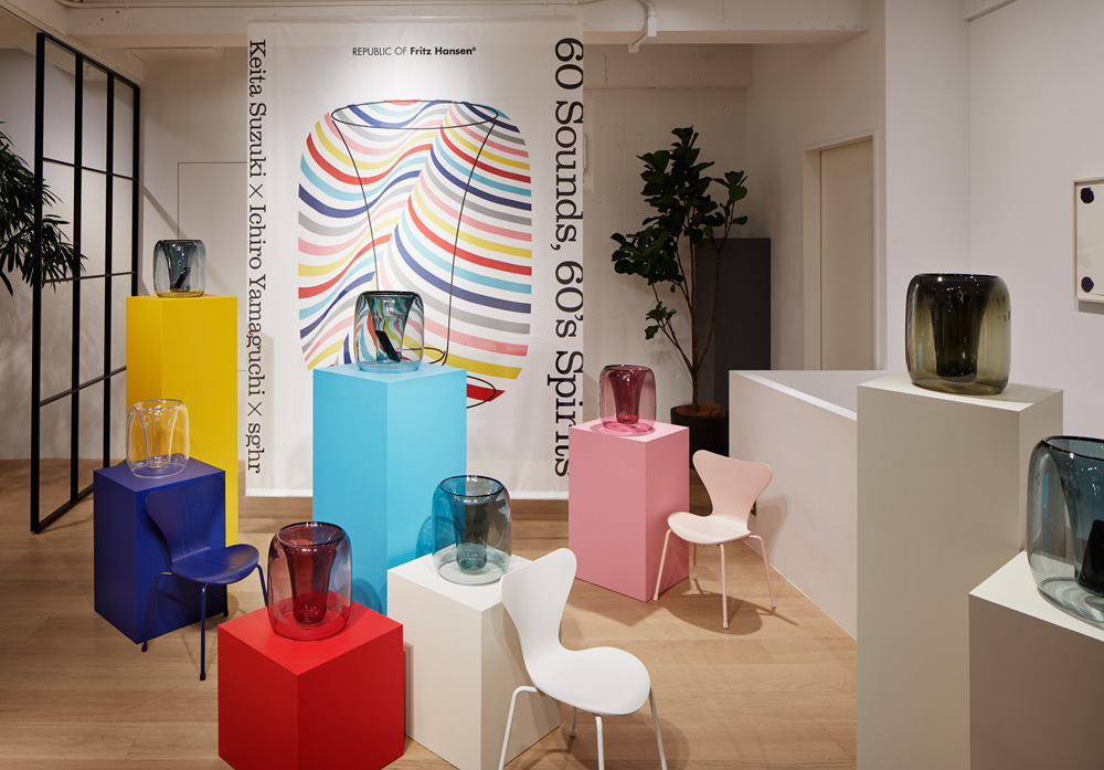 フリッツ・ハンセン青山本店では、プロダクトデザイナー・鈴木啓太は、新作のガラススピーカー「エクスポネンシャル」を発表。サカナクションの山口一郎とのコラボレーションによってサウンドインスタレーション「60 sounds, 60’s spirits」を開催した。