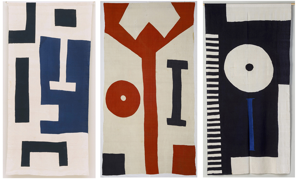 柚木沙弥郎 左:《無題2019-2》2019年 個人蔵 / 中:《型染布「2016」》2016年 日本民藝館蔵 撮影:村林千賀子 / 右:《Memory》2019年 IDÉE蔵 撮影:乾剛