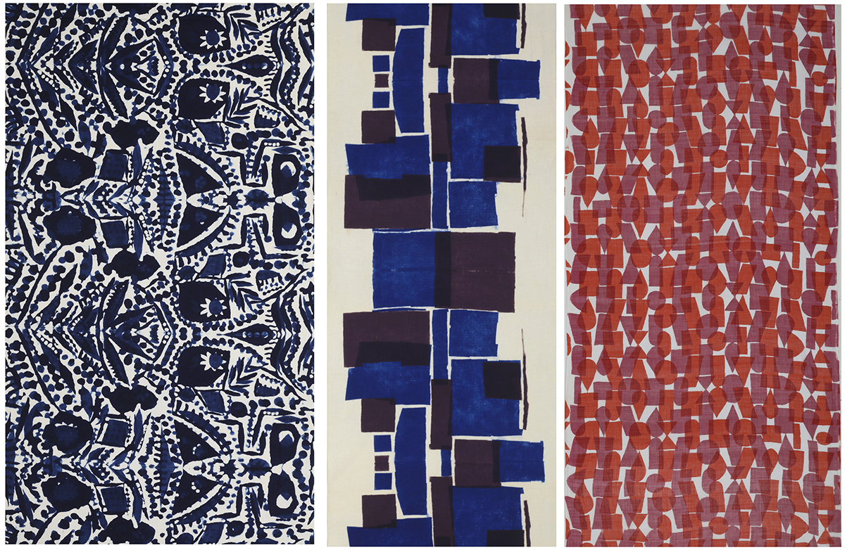 柚木沙弥郎 左:《注染ロマネスク文布》(部分) 1959年 / 中:《注染幾何文布》(部分) 1950年代 / 右:《注染幾何文布》(部分) 1980年代 日本民藝館蔵 撮影:村林千賀子