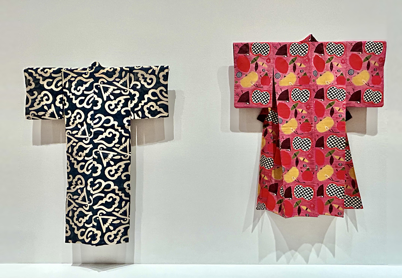 柚木沙弥郎 左:《型染大空文着物》1976年 / 右:《型染着物「万物迎春」 》1968年頃 個人蔵 撮影:Alma Reyes